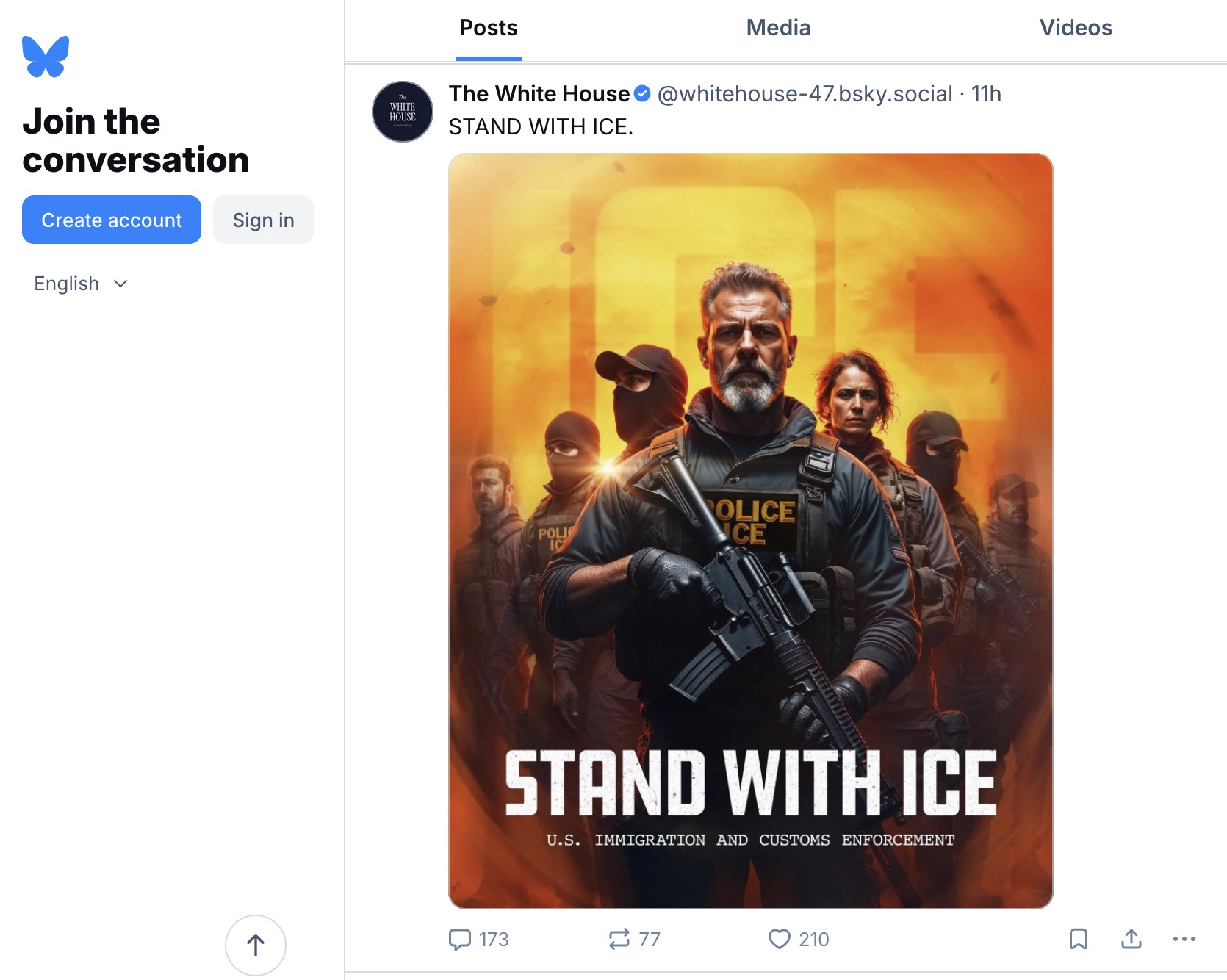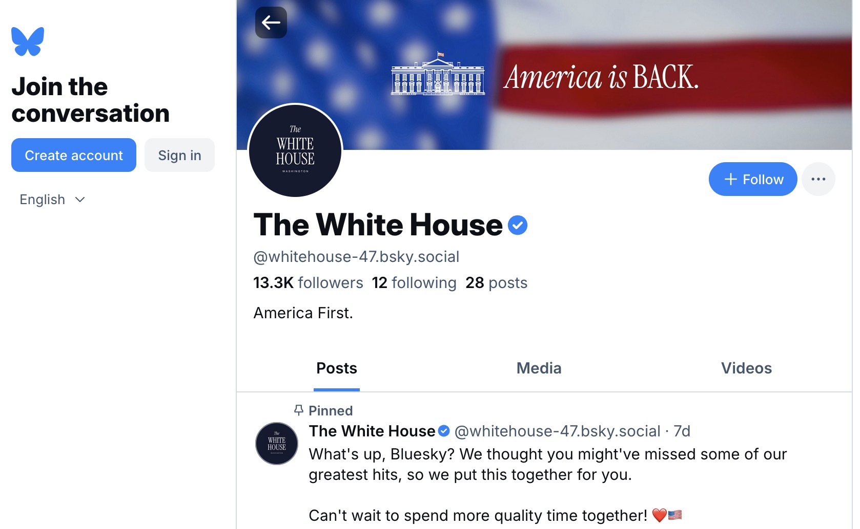 Yes, the oasis of freedom, the place that wanted to be better than Twitter — the open, federated space — has succumbed to the obvious and opened its gates to the incomprehensible. The feel-good bubble has burst, Bluesky has been invaded and this status quo will be permanent — accompanied by the White House's „What's up, Bluesky?“ post. Apart from the seemingly randomly chosen usernames (did nobody tell the tech-savvy people there that proper handles look more professional and authentic?), the creation of all those accounts seems like a cheap trick to further destabilize trust in independent social media – so far the focus seemed to be rather on trolling democrats and recruiting new ICE-staff if you have a look on the first posts.